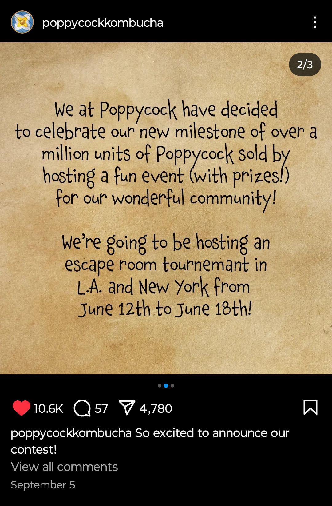 A social media announcement of a fitting milestone campaign for Poppycock. Their posts keep to the fun and whimsical nature of the product’s style while the idea of an escape room tournament suits the demographic of adventure loving puzzle solvers.